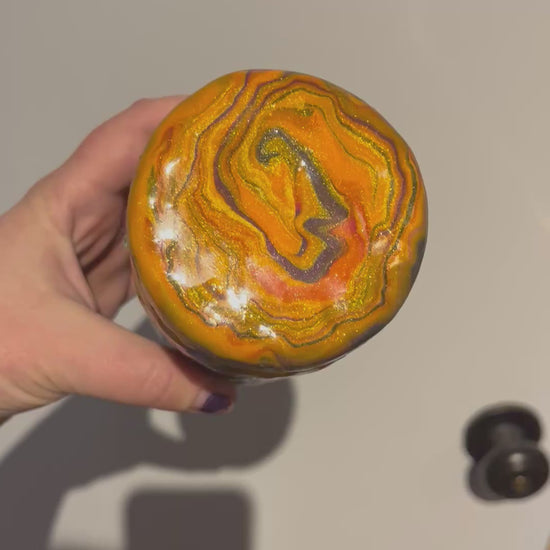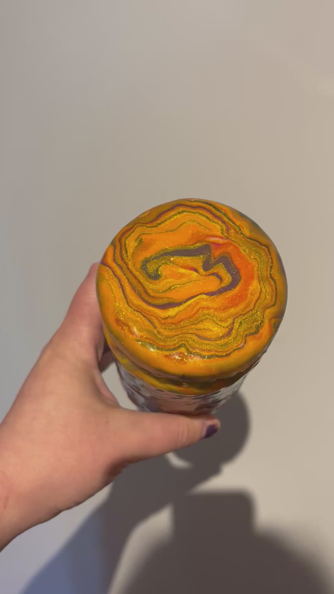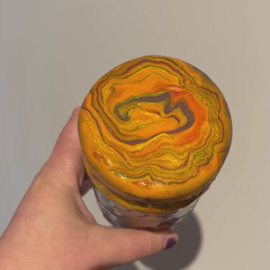 This repurposed glass jar is transformed into an abstract mountain landscape, hand-sculpted with flowing polymer clay peaks that melt into grassy textures below. Coated in a glossy UV resin for a polished finish, it’s a one-of-a-kind piece for storing herbs, small treasures, or just adding a bit of strange beauty to your shelf.